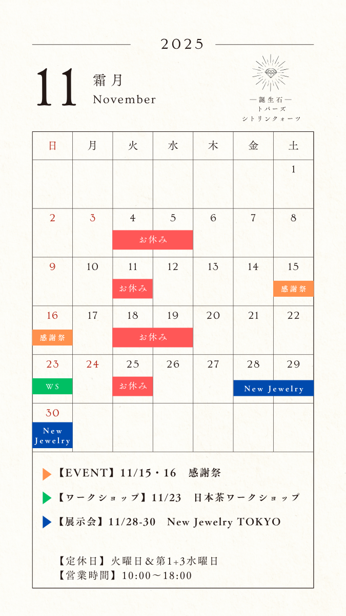 いつも青沼貴金属店をご愛顧お引立ていただきより感謝と御礼を申し上げます。今年は何かにつけて激しさを感じる事の連続ですが、皆様いかがお過ごしでしょうか。年の瀬も近い晩秋の候 弊社は無事過ごせることに、ひと際の感謝とありがたさを感じております。そんな思いから今回「秋の感謝祭」を二日間という、短い日程ですが開催させていただく運びとなりました。時節柄ご多望と存じ上げますが、どうぞこの機会も輝くジュエリーでときめきの世界をご堪能ください。スタッフ一同、心より皆様のご来場をお待ちしております。